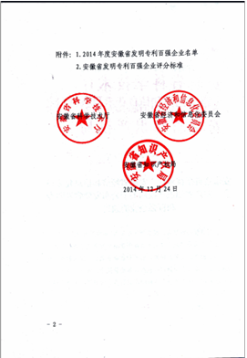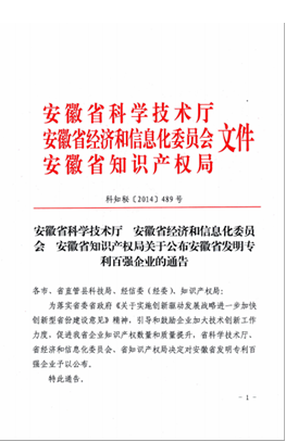 2014年12月24日安徽省科學技術廳、安徽省經濟和信息化委員會、安徽省知識產權局聯合公布的安徽省發明專利百強企業名單,合肥星宇公司名列第68位,這是對合肥星宇公司自成立以來高度重視知識產權和技術創新工作的肯定和激勵。(王蘭蘭)