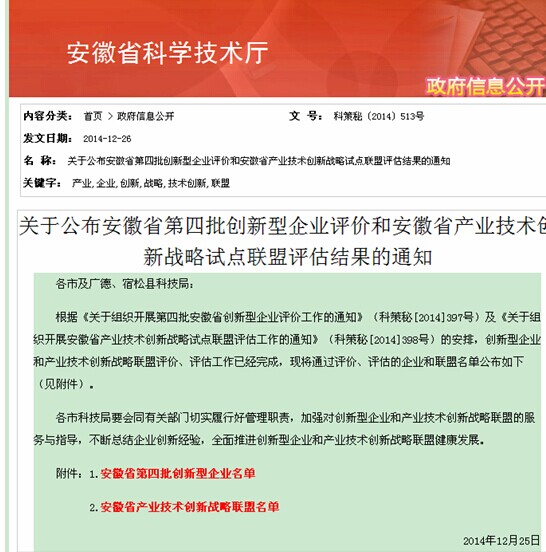 我公司作為安徽省第四批創(chuàng)新型試點(diǎn)企業(yè),根據(jù)《關(guān)于組織開展第四批安徽省創(chuàng)新型企業(yè)評(píng)價(jià)工作的通知》(科策秘[2014]397號(hào))要求,參與創(chuàng)新型企業(yè)評(píng)價(jià),評(píng)估工作已經(jīng)完成,安徽省科技廳網(wǎng)站2014年12月25日公布了通過評(píng)價(jià)的安徽省第四批創(chuàng)新型企業(yè)名單,合肥星宇公司名列其中。(