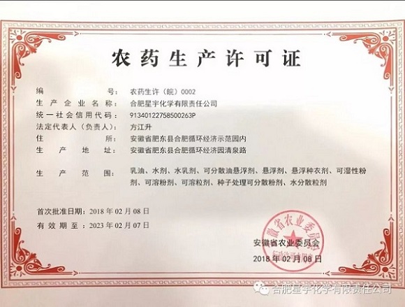 2018年2月8日合肥星宇化學有限責任公司迎來了新時代——新生產(chǎn)許可證時代。做為安徽省第一批獲得該證的農(nóng)藥原藥、制劑定點生產(chǎn)企業(yè),一張薄薄的證書凝聚了多少星宇人的汗水與智慧,彰顯了星宇化學在安徽農(nóng)藥行業(yè)的實力與地位。 2017年新農(nóng)藥管理條例頒發(fā)后,對生產(chǎn)企業(yè)執(zhí)行生產(chǎn)許可證制,新規(guī)定對廠房、生產(chǎn)設(shè)備、質(zhì)量檢驗、安全制度、環(huán)保設(shè)施、配套管理制度等都有嚴格要求,星宇人針對新規(guī)定要求,結(jié)合自身自成立以來建立的一整套標準與規(guī)范,提前準備材料,新規(guī)定執(zhí)行后第一時間提出申請。