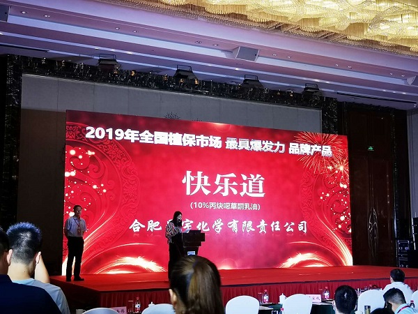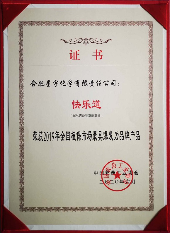 由中國農藥工業協會主辦的第七屆中國農藥行業經濟運行分析會暨中國農藥企業銷售百強發布會中,合肥星宇“快樂道”榮獲“2019年全國植保市場最具爆發力品牌產品”,其有效成分丙炔噁草酮是公司主打的優勢原藥。