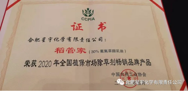 第八屆中國農藥行業經濟運行分析會暨中國農藥企業銷售百強發布會上,合肥星宇化學有限責任公司“稻管家”榮獲2020年全國植保市場除草劑暢銷品牌產品。