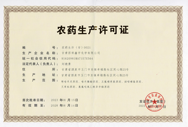 日前,甘肅西部鑫宇化學有限公司順利取得農藥生產許可證正式成為國家批準的規范化農藥生產企業。